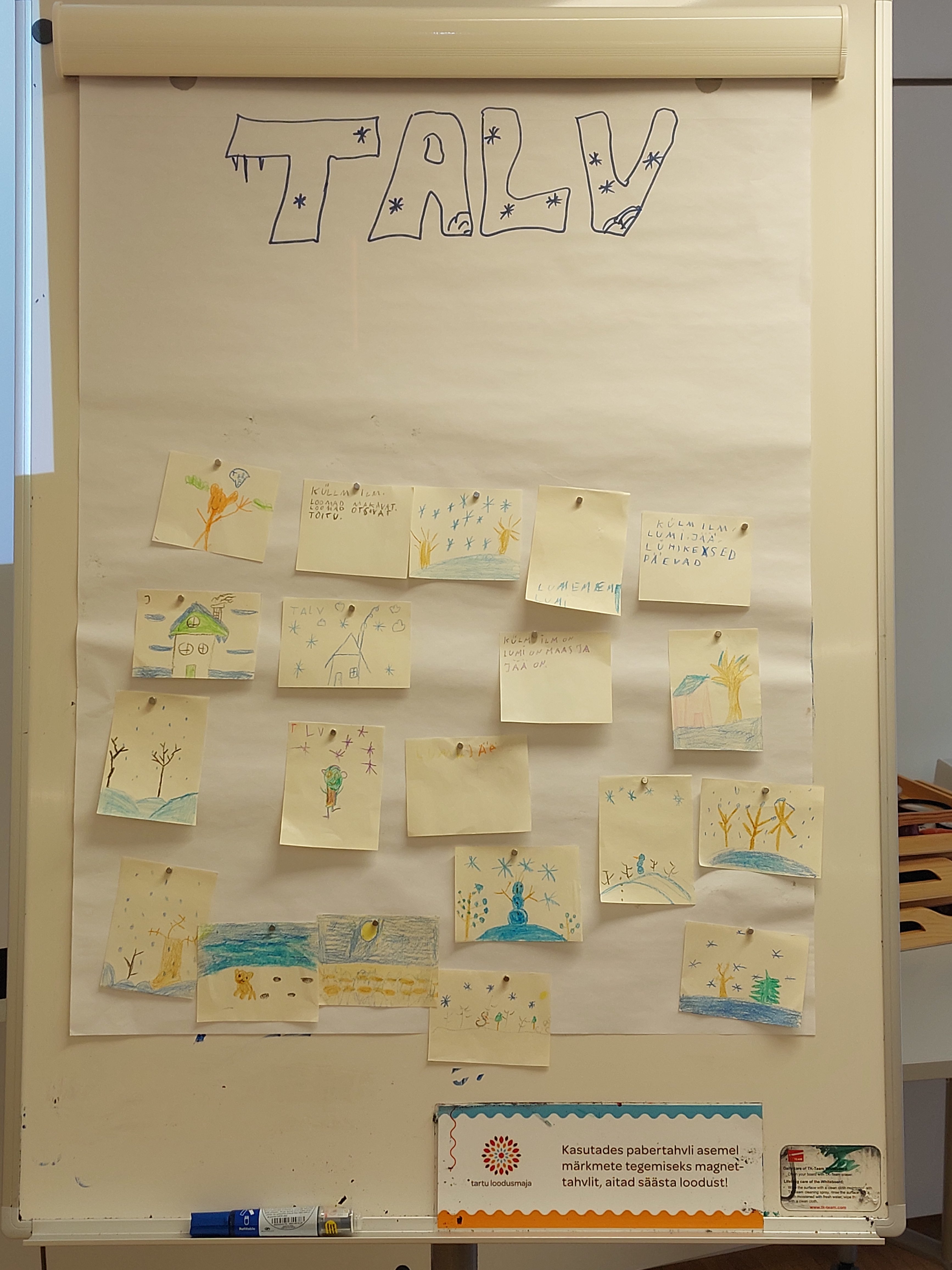 Arutlesime talve üle, missugune aastaaeg see talv üldse on. Vaatasime pilte ning lühikesi filmiklippe loomade talvenippide kohta. Mängisime mänge, kus rakendasime eelnevalt õpitut.