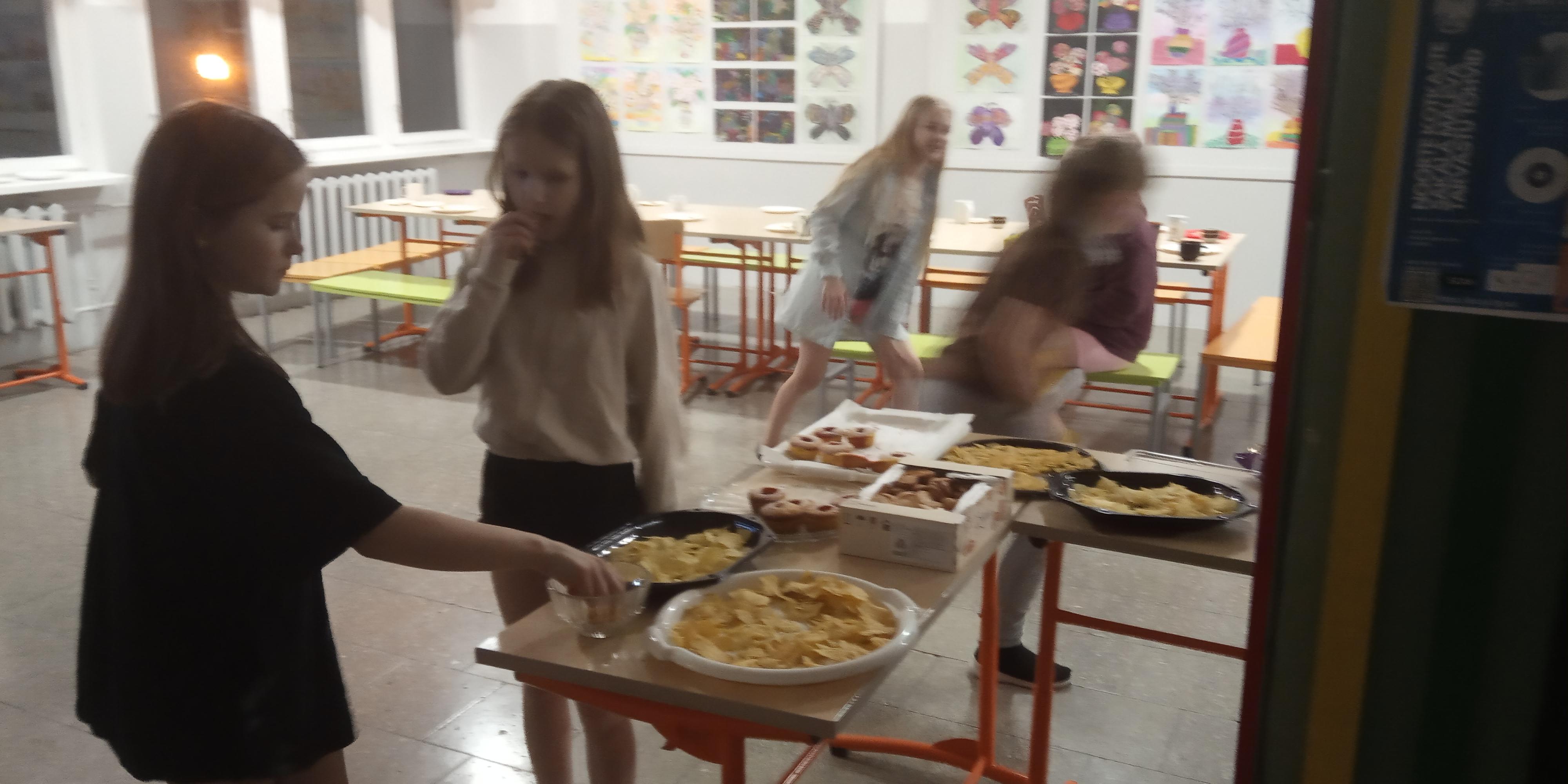 Õhtu saabudes kogunesid kõik 4. klassi õpilased uuesti koolimajja. Mõned tõid snäkke, näiteks melonit, krõpsu, nätsukomme, viinamarju ja karastusjooke. Kohale tuli 20 õpilast ja 1 õpetaja. Pakkusime erinevaid mänge mängimiseks, millest suurema osa jõudsime ka mängida. Nendeks olid - pikk nina, mõrvar, silmapilgutamine, tantsimine, telefon, Kahoot! ja peitus. Peitust mängisime siis, kui õues oli pime ning peale meie polnud enam koolimajas kedagi. Pärast vaatasime „Madagaskari“ filmi, oli disko ja vaba aeg. Öörahu saabus peale kella kahtteist.