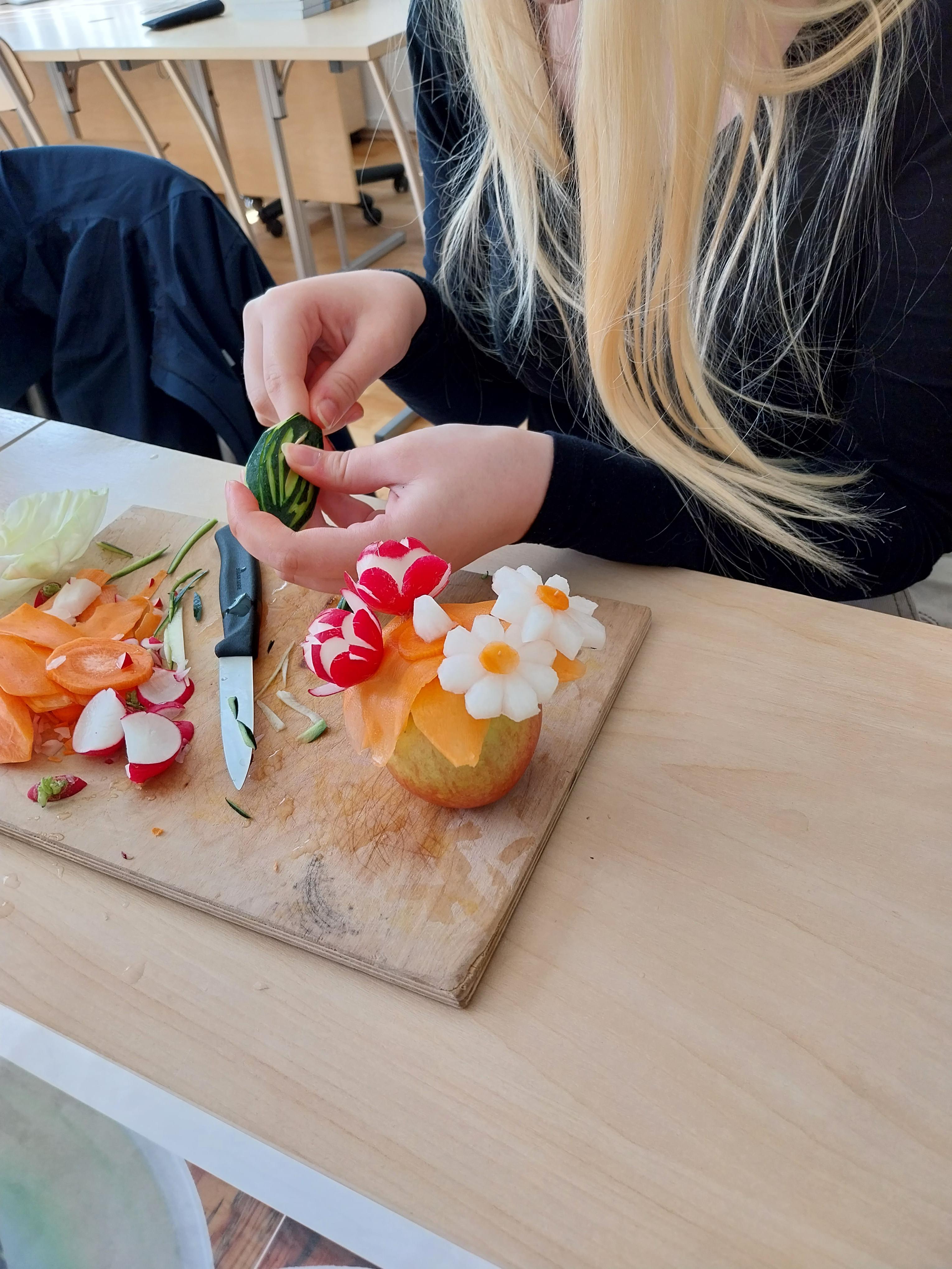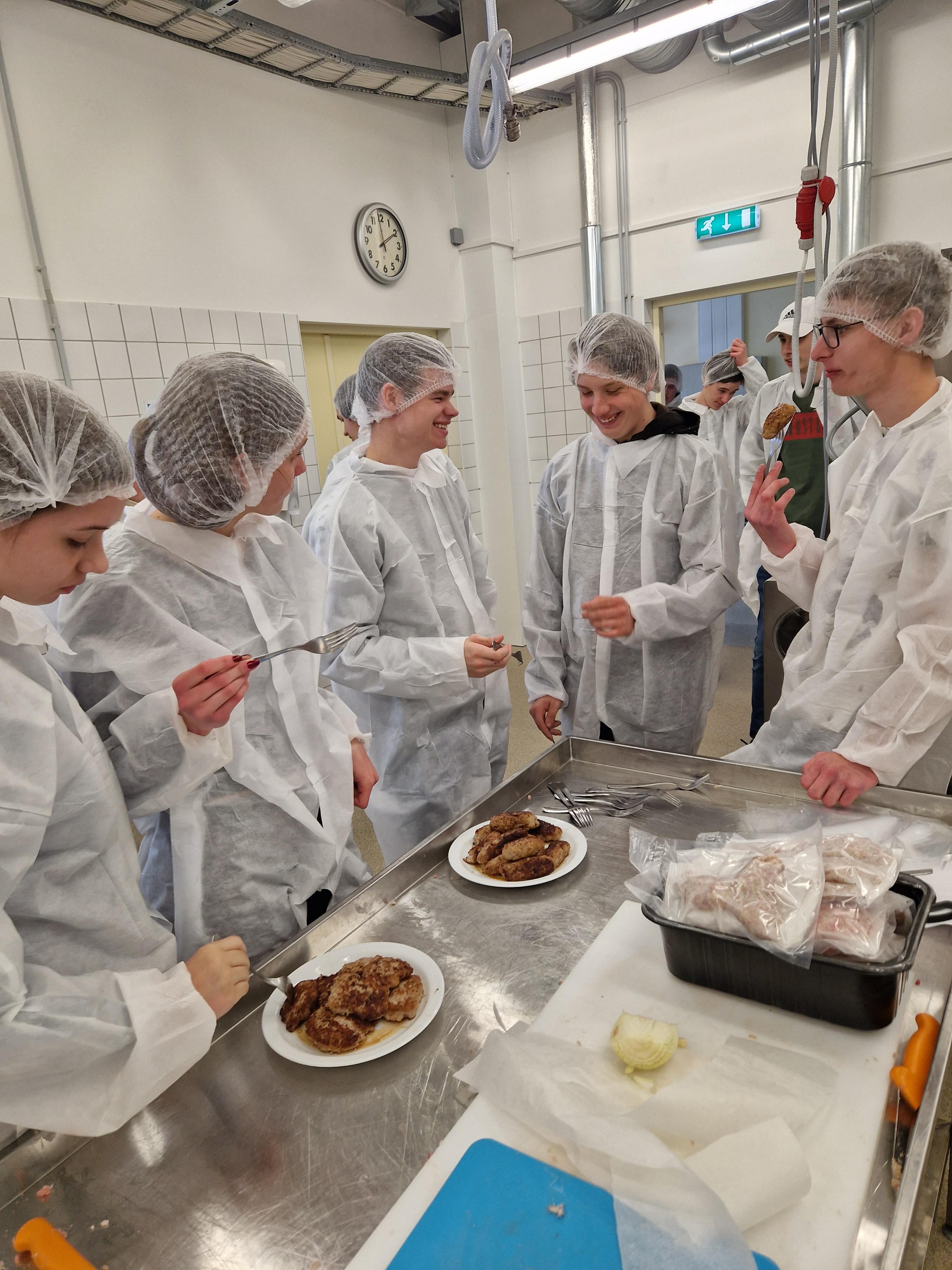 Kõigepealt tutvusime koolis õpetatavate erialade ja erinevate õppehoonetega. Seejärel töötoas valmistas üks grupp kebabi ja kotlette ning teine fruktodisaine.