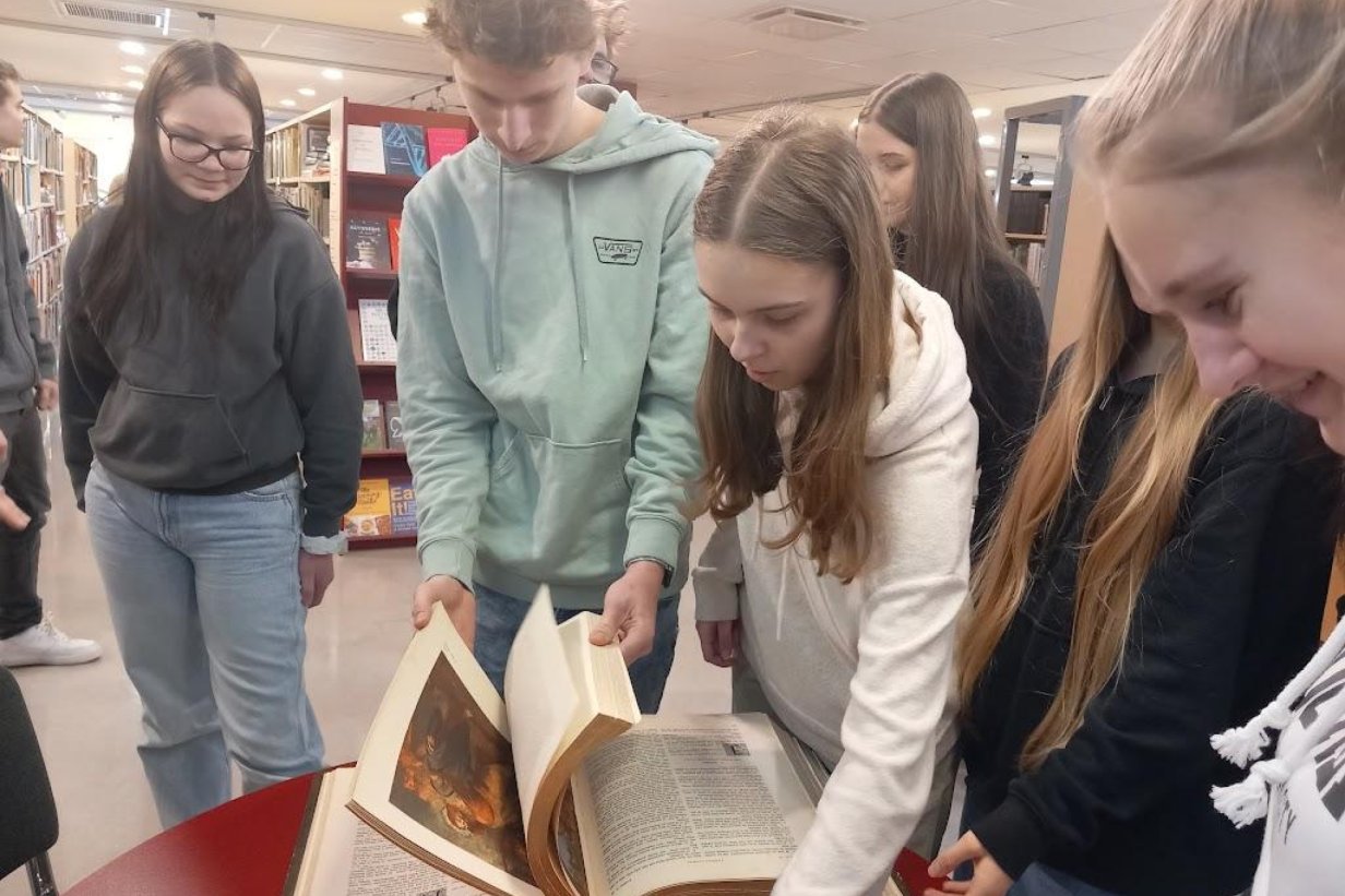 Järgnes ringkäik raamatukogu ruumides ja näitusesaalis. Õpilased said oma käega katsuda ja lehitseda nii pöidlasuuruseid raamatuid kui ka 1300-leheküljelist piiblit ja umbes ruutmeetrisuuruste lehtedega raamatut.