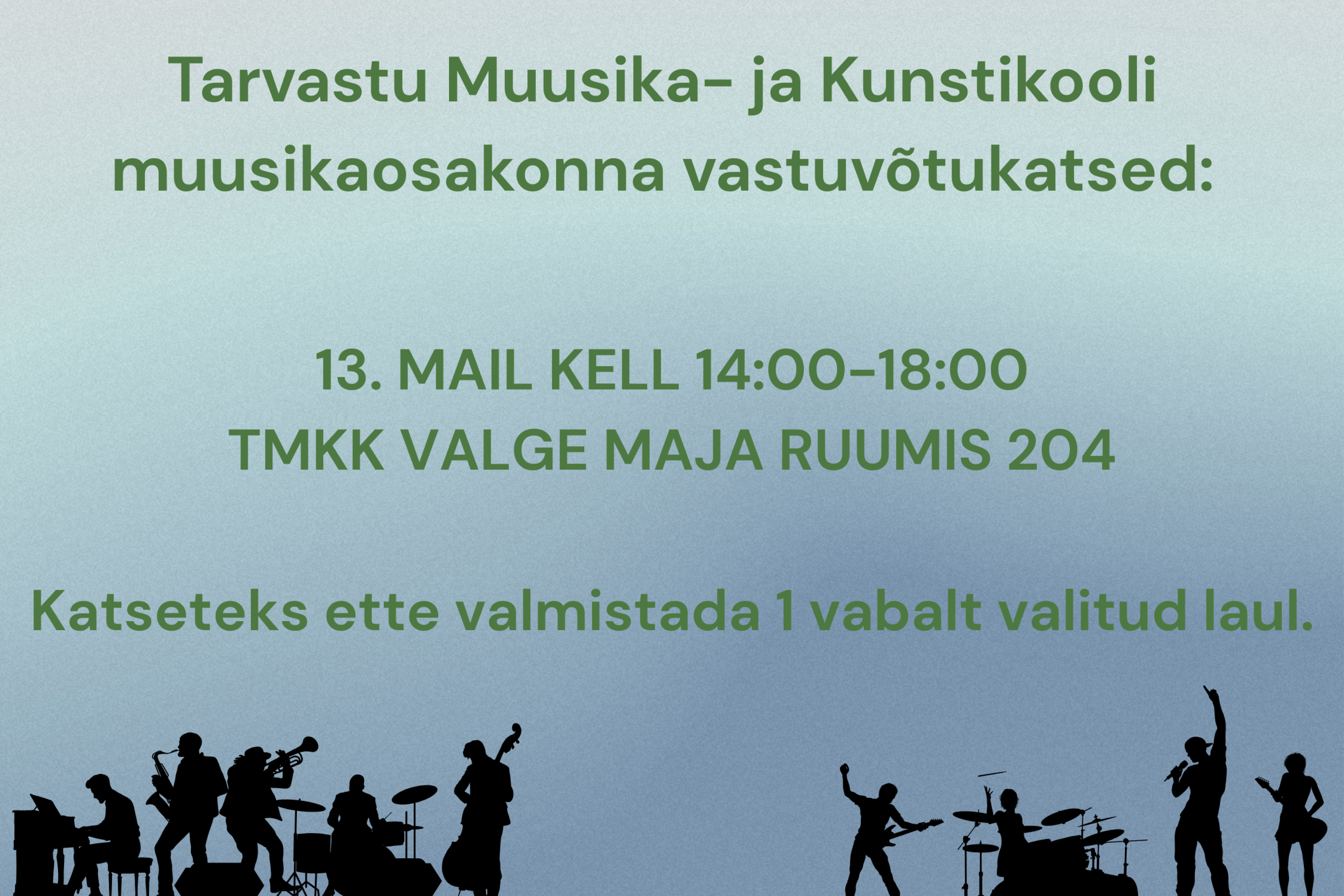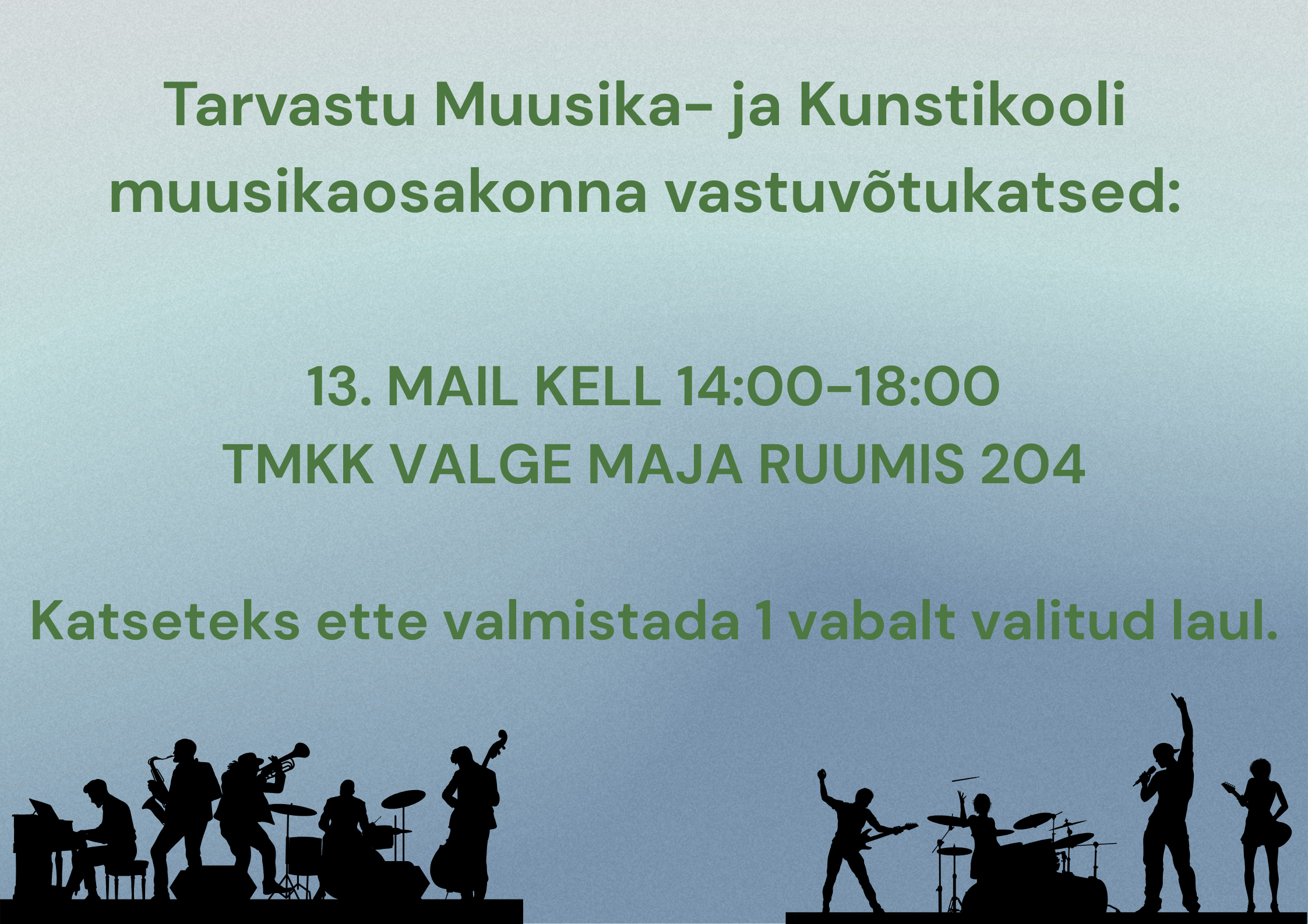 Rohkem infot: https://tarvastu.vil.ee/et/tarvastu-muusika-ja-kunstikool/vastuvott-huvikoolilink opens on new page Ava foto Viimati muudetud 29.04.2026.