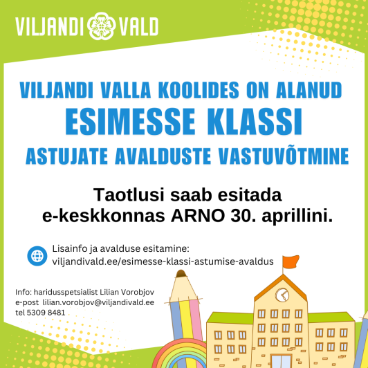 Täpsem info taotluse esitamiseks: https://www.viljandivald.ee/toiming/1-klassi-astumise-avalduslink opens on new page