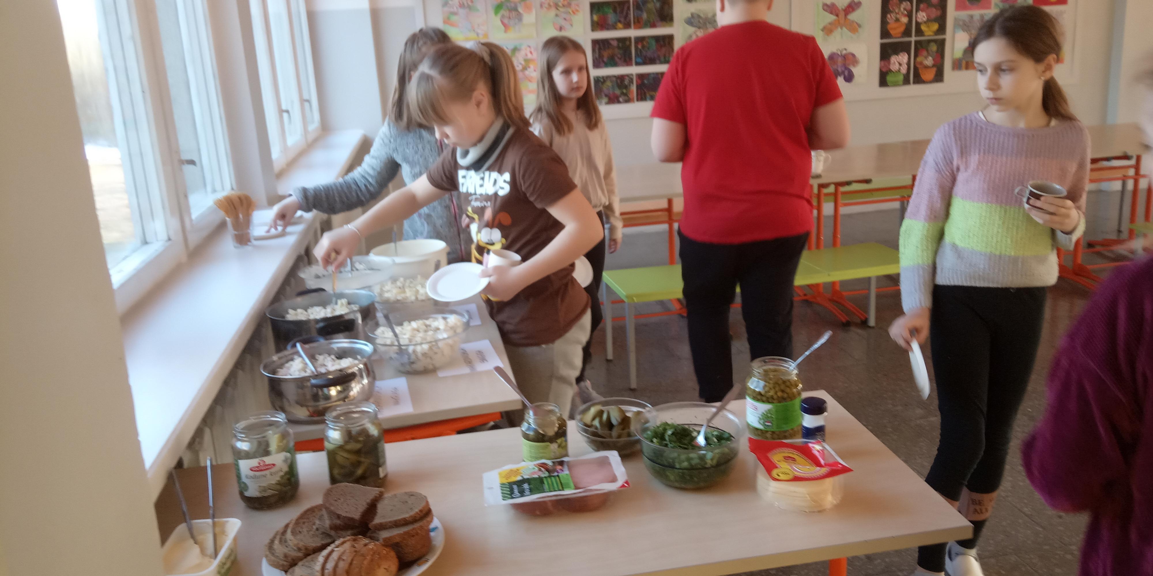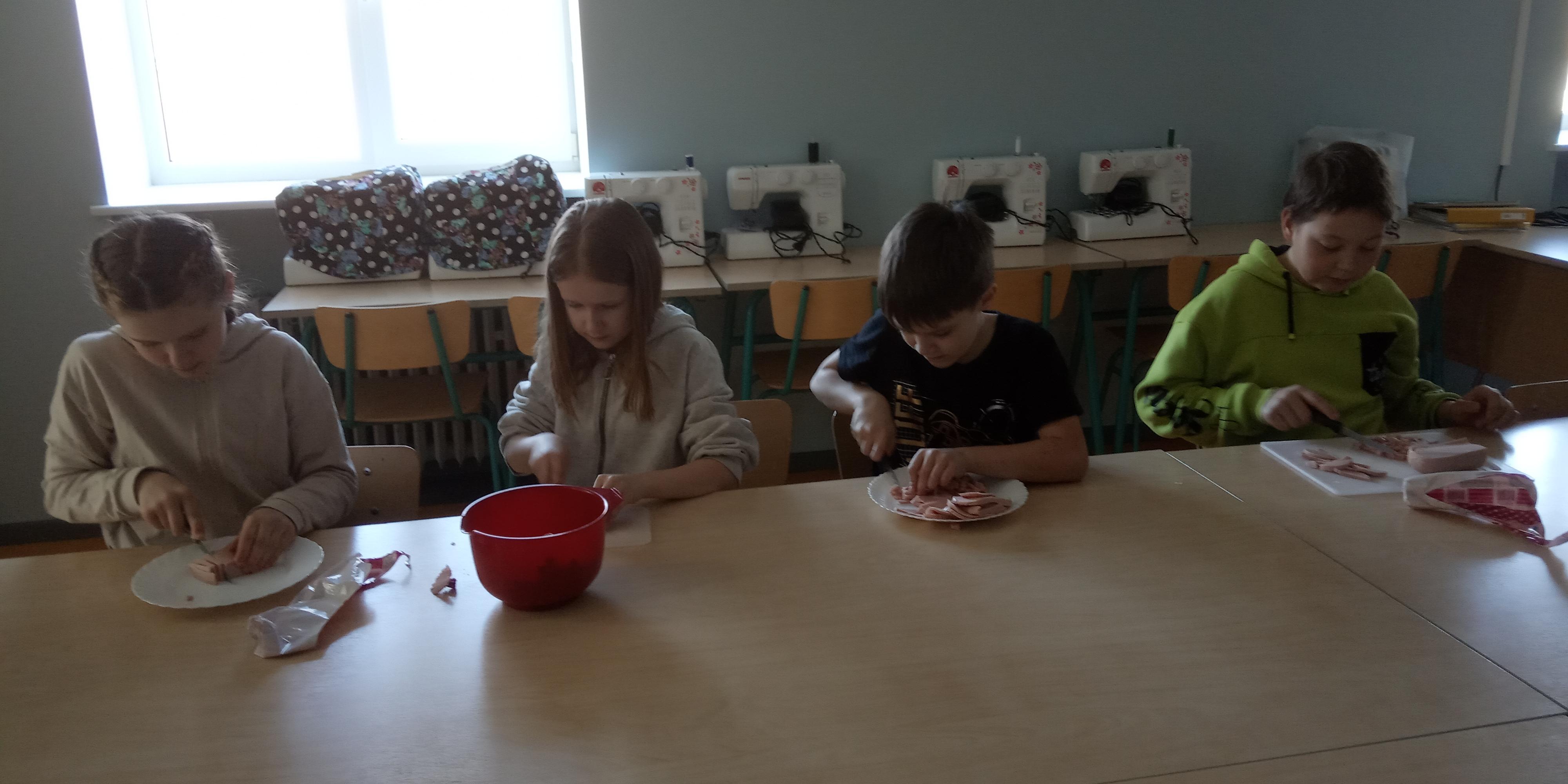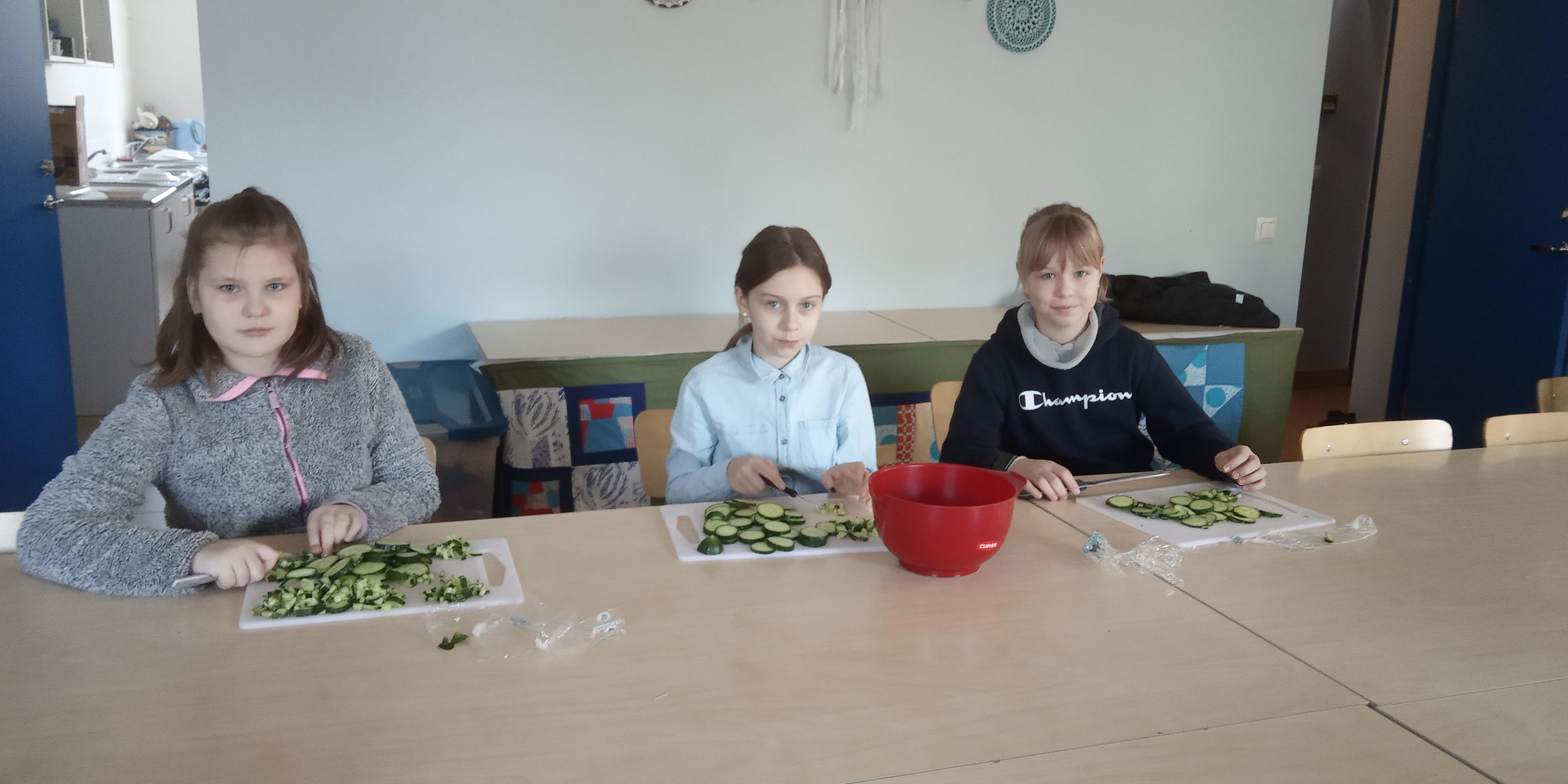 Reede, 1. aprilli hommik algas sellega, et 4. klass läks valgesse majja ja tegi seal klassiõhtuks salateid. Mõned lapsed lõikasid vorsti, teised aga sinki. Kolm õpilast koorisid kartulit ja kaks lõikusid krabipulki. Lõpuks valmis meil viis erinevat salatit. Seejärel jätkus koolipäev tavapäraselt.