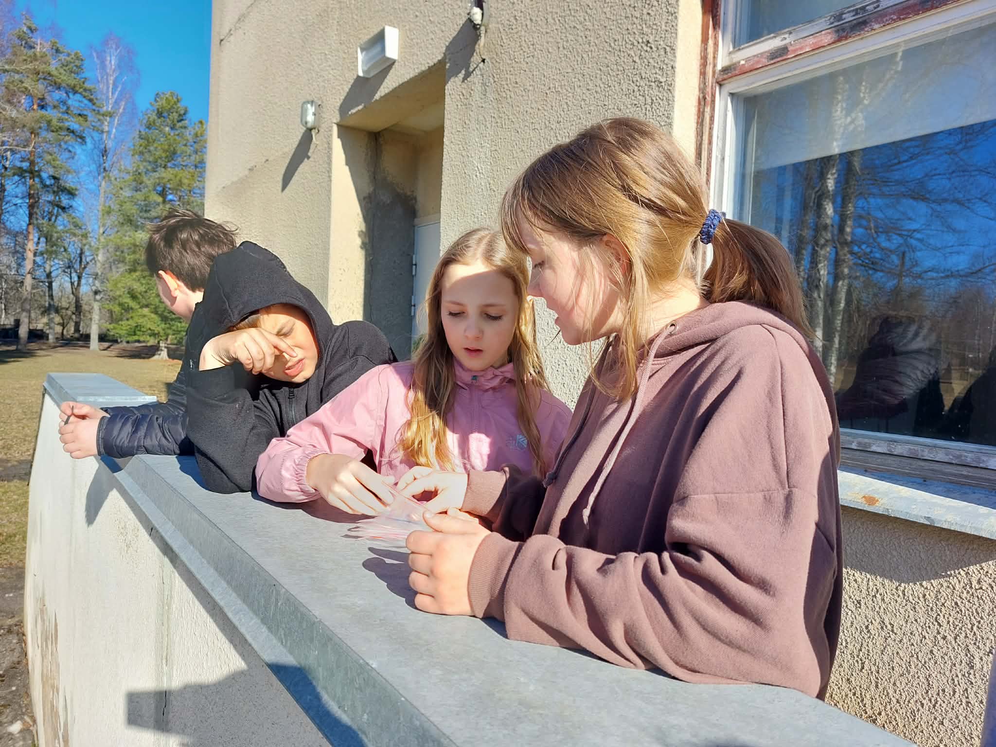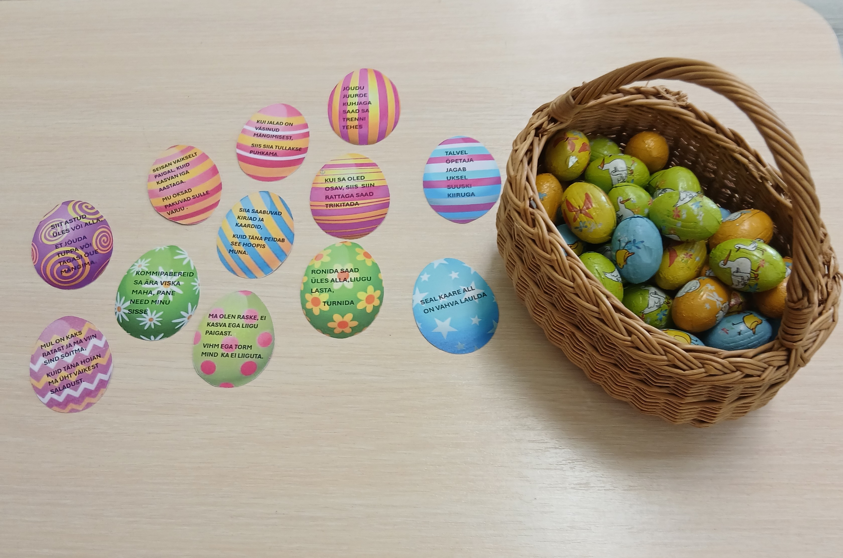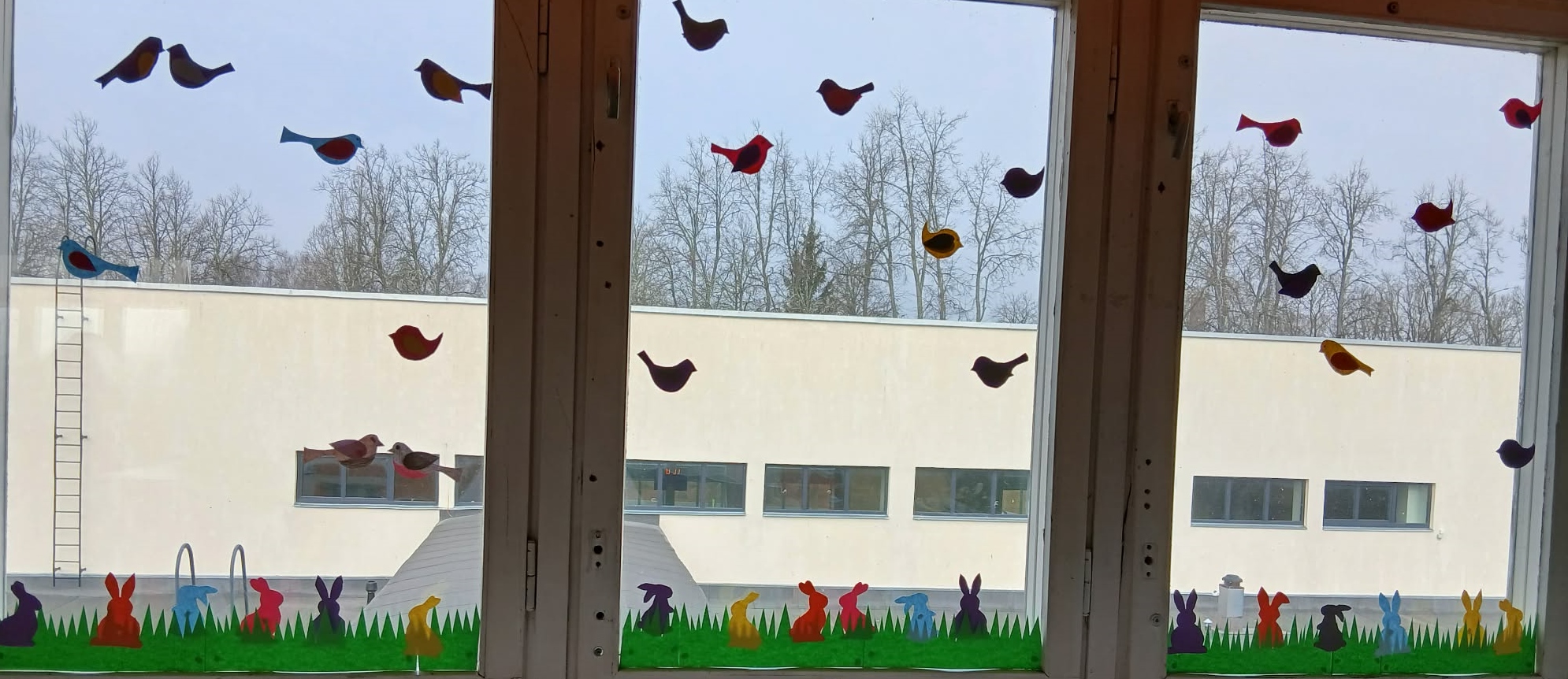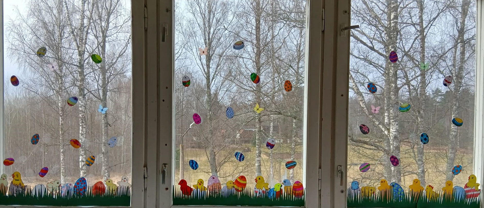 KEVADPÜHADE nädal tõi algklassi lastele uusi teadmisi ja põnevaid tegemisi. Pühade meeleolu oli tunda juba koridoris, kus aknad said uhkelt kaunistatud. Seal võis kohata lilli ja liblikaid, linde ja putukaid, jänkusid ja värvitud mune, isegi linnukesed olid pesa aknalauale teinud. Uudistada sai ka värvitud munade näitust. Neljapäeval said kõik osa lõbusast MUNAJAHIST. Kooli õuealalt tuli juhiste järgi üles otsida 12 muna. Iga muna juures oli peidus üks pusletükk ja klassis tuligi kevadpühade pusle kokku panna. Kes tööga hästi toime tuli võis koridoris seotud silmadega pühadejänkule muna anda. Jänkupoiss kostitas tänutäheks lapsi šokolaadist munaga.