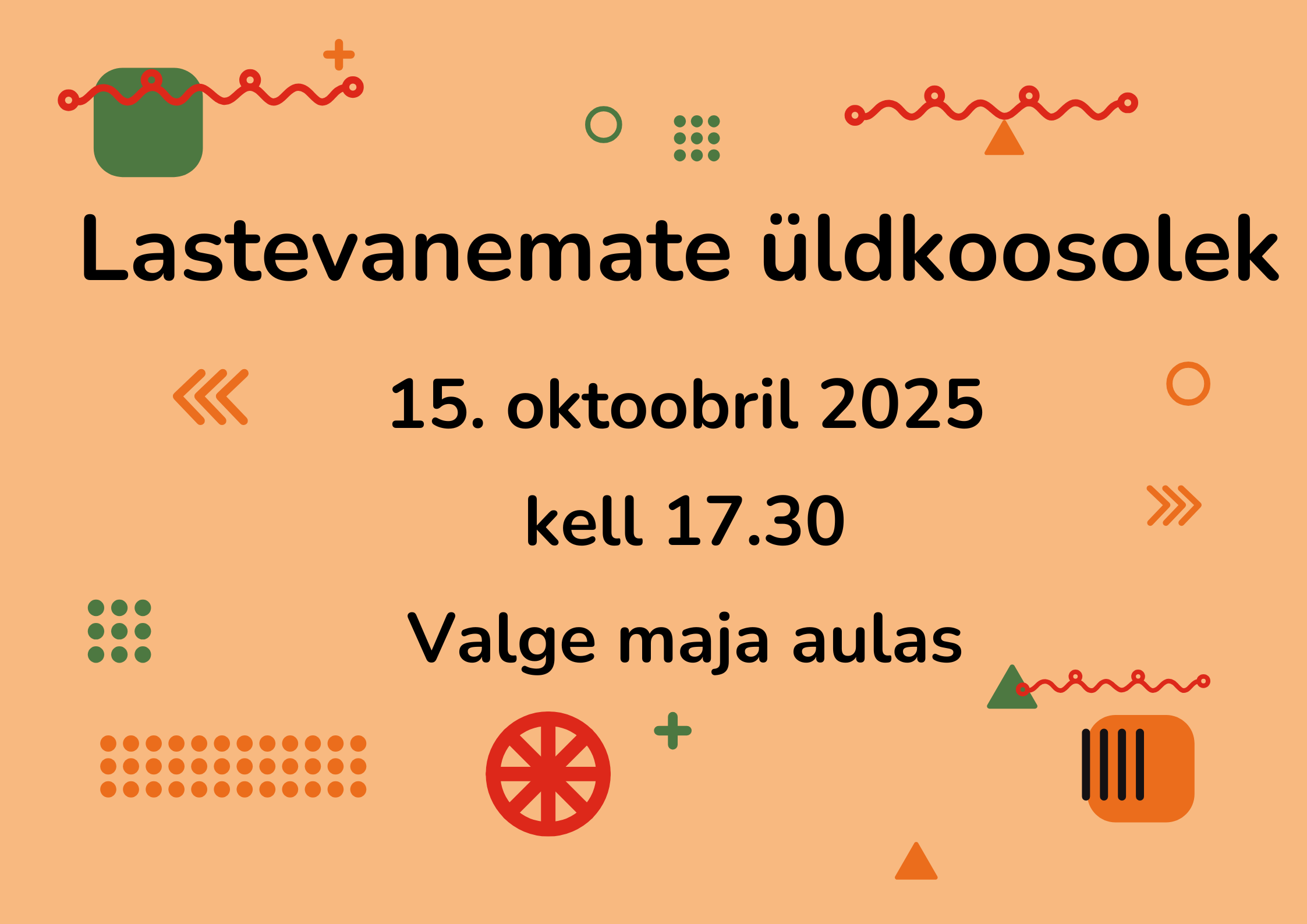 Ootame teid lastevanemate koosolekule 15. oktoobril 2025 kell 17.30 Tarvastu Muusika- ja Kunstikooli maja (valge maja) aulasse.
