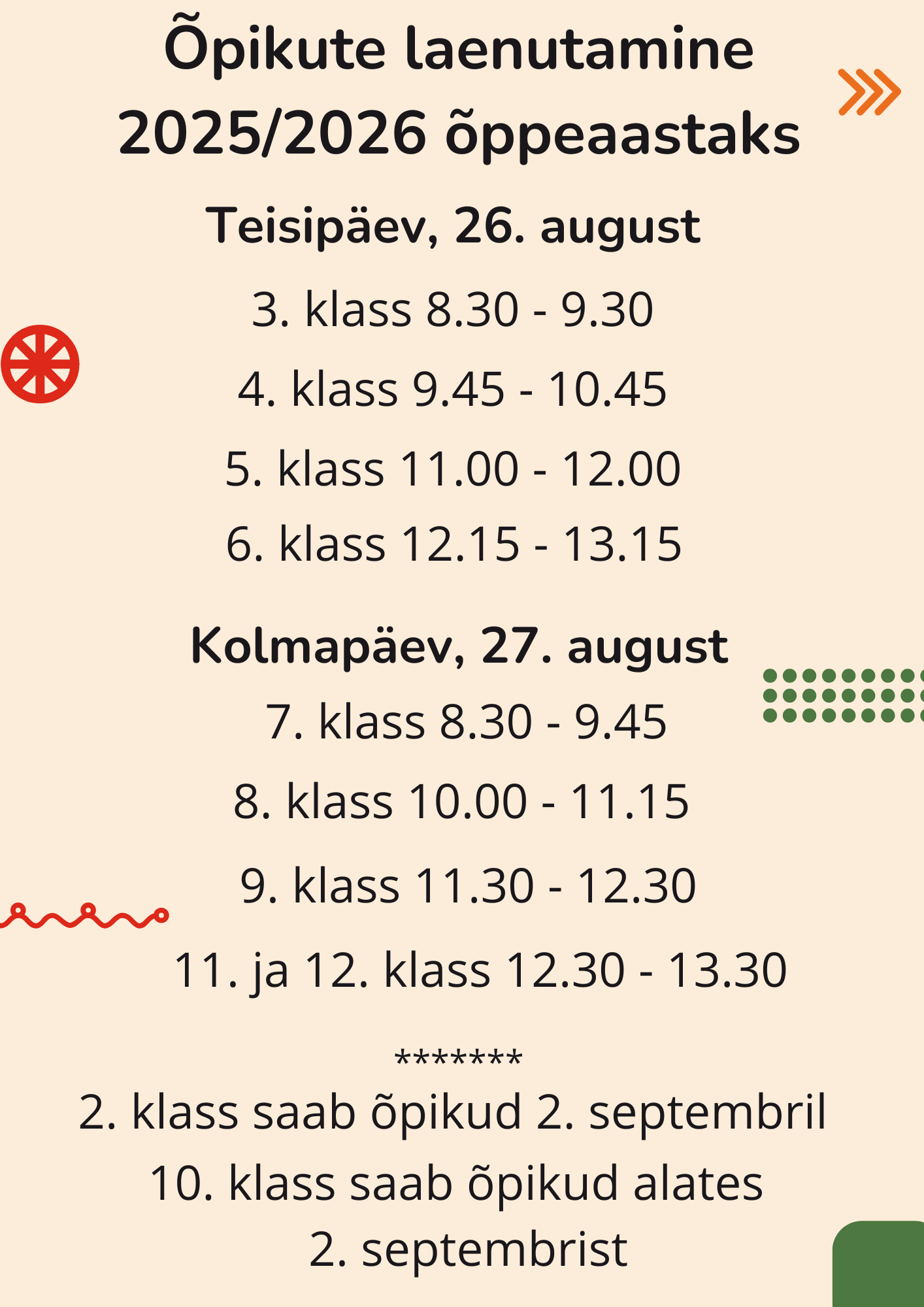 Sel aastal saab 2. klass õpikud 2 septembril ja 10. klassile õpikute laenutamine toimub alates 2. septembrist.
