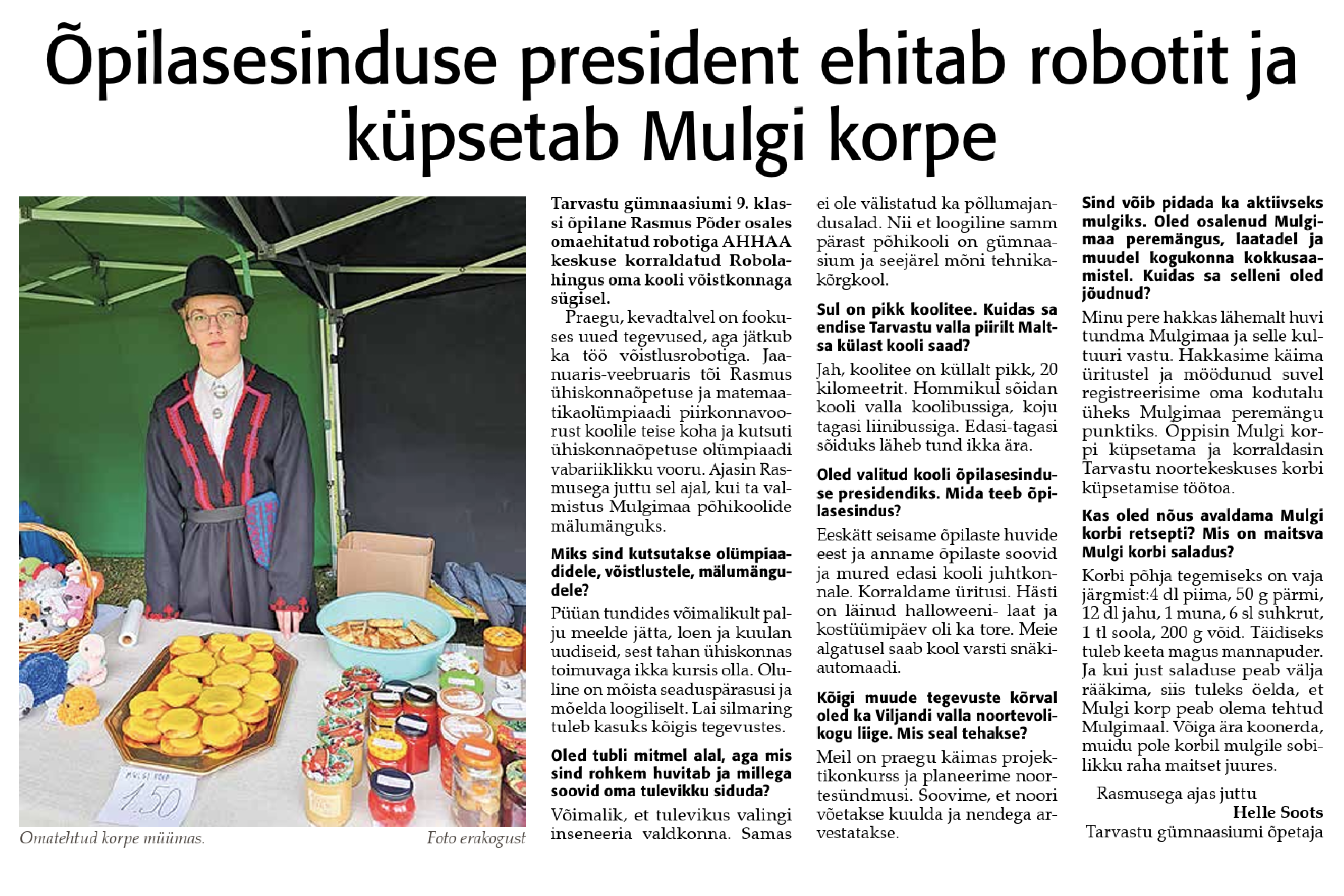 Tarvastu gümnaasiumi 9. klassi õpilane Rasmus Põder osales omaehitatud robotiga AHHAA keskuse korraldatud Robolahingus oma kooli võistkonnaga sügisel. Praegu, kevadtalvel on fookuses uued tegevused, aga jätkub ka töö võistlusrobotiga. Jaanuaris-veebruaris tõi Rasmus ühiskonnaõpetuse ja matemaatikaolümpiaadi piirkonnavoorust koolile teise koha ja kutsuti ühiskonnaõpetuse olümpiaadi vabariiklikku vooru. Ajasin Rasmusega juttu sel ajal, kui ta valmistus Mulgimaa põhikoolide mälumänguks.