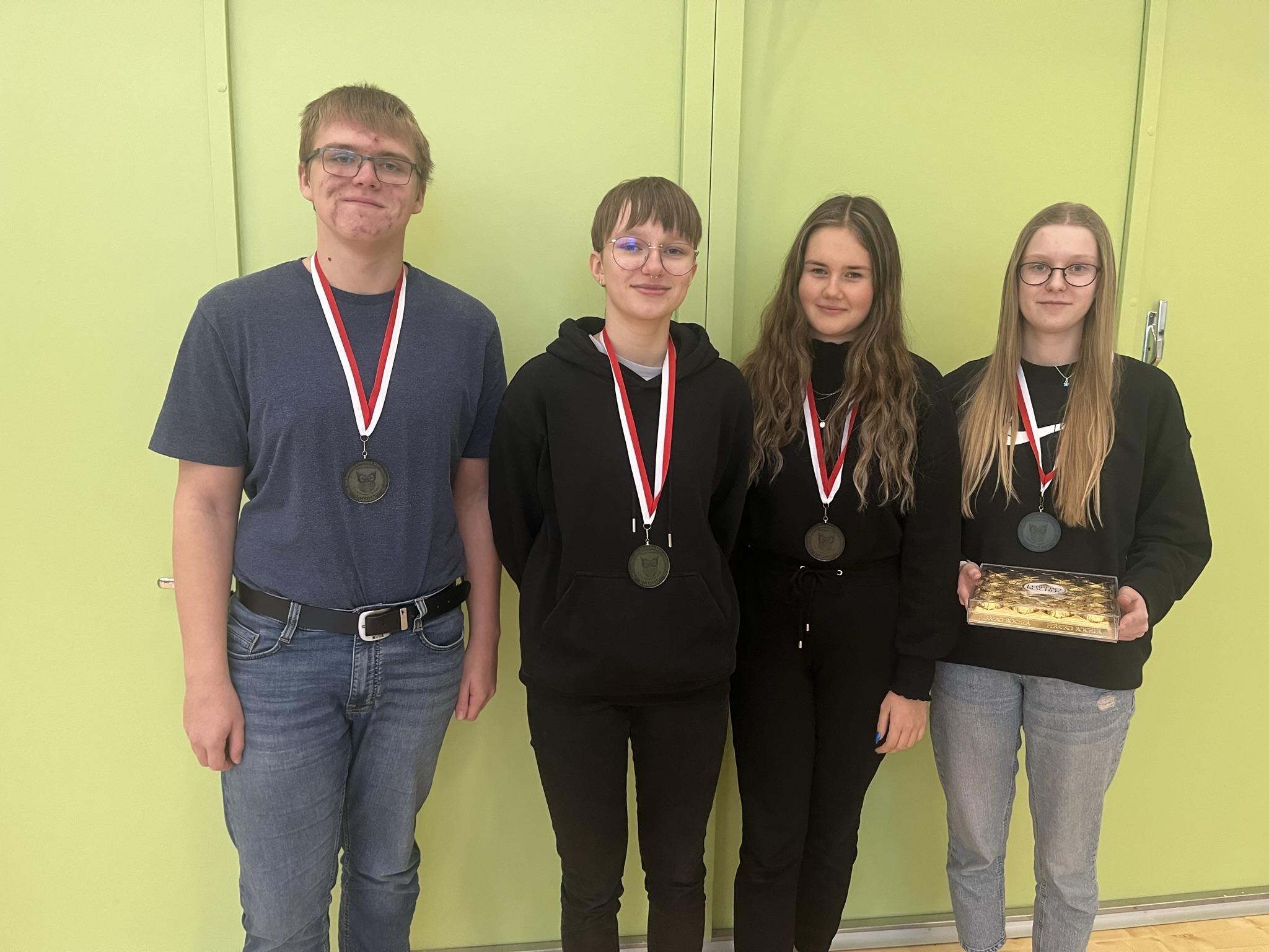 Tarvastu Gümnaasium 1 (Liisa Aedma(8), Alexandra Muts(8), Vaido Veiper(9), Tauno Kobin(9), õp Kersti Vunder ja õp Enna Ojaots)