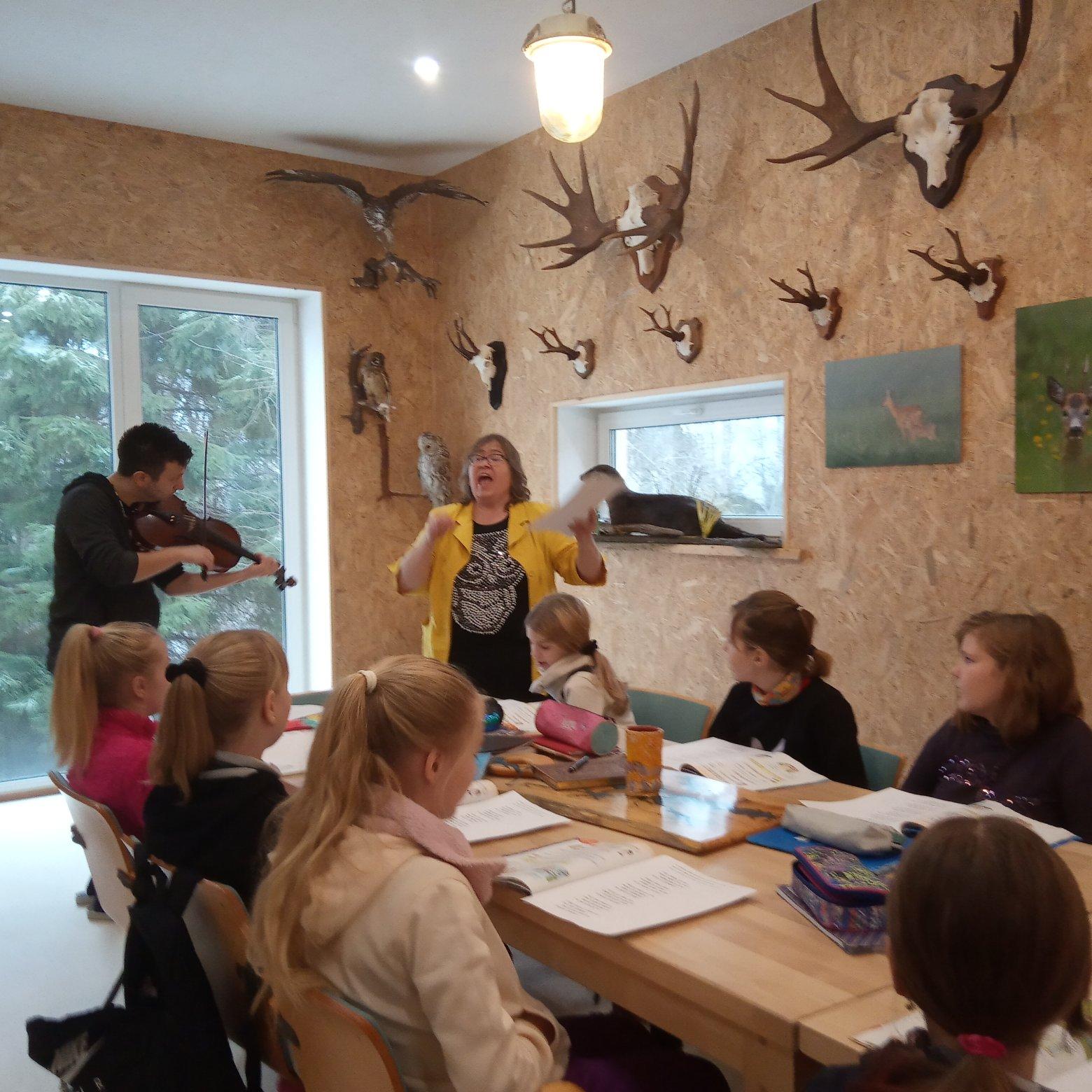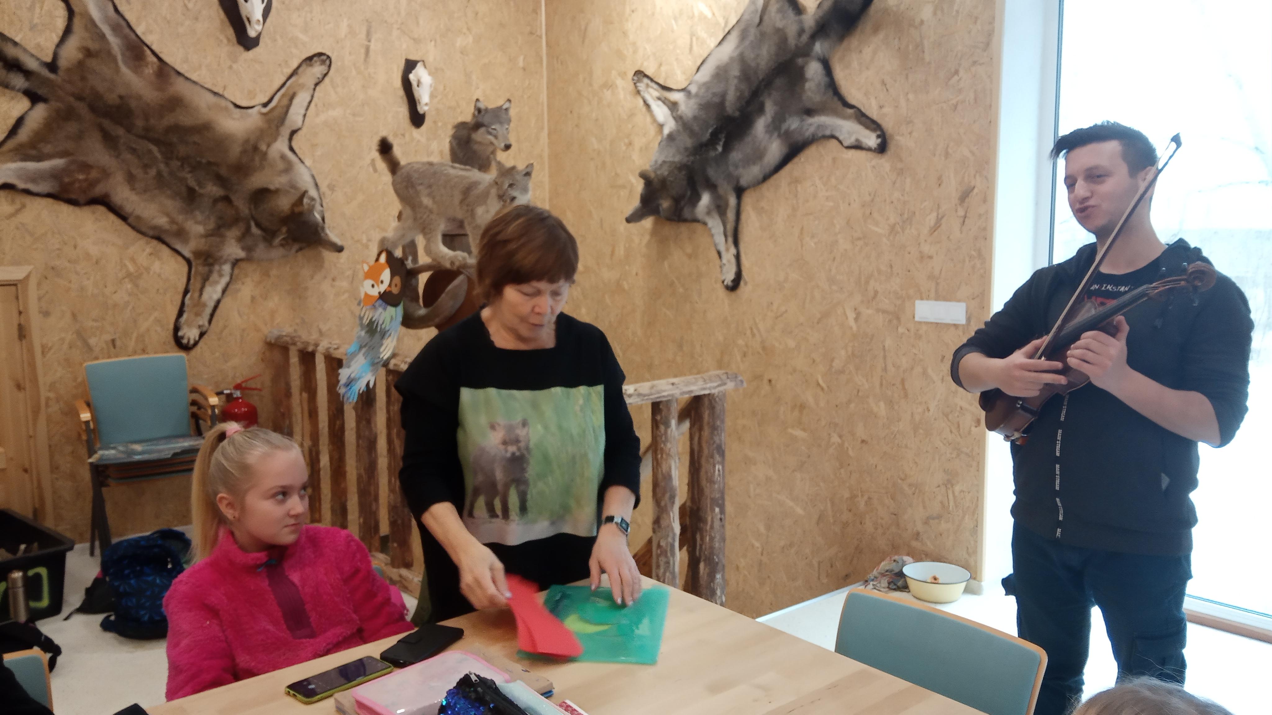 Pärast jalutuskäiku Soe loodusõpperajal tulid meile külla õpetaja Piret ja Ljupcho, kes saabus hiljuti Makedooniast ning töötab meie lasteaias ja noortekeskuses vabatahtlikuna. Temaga saime suhelda inglise keeles. Kuna Ljupcho on oma kodumaal vioolaõpetaja, oli tal ka pill kaasas ja mängis meile nii Makedoonia rahvamuusikat kui ka klassikalisi muusikapalu. Tema pilli saatel laulsime koos „Mutionu pidu“, sest meie eesti keele tunni töö oli just selle laulu sõnadega seotud. Ka matemaatika ülesanded olid loomateemalised.